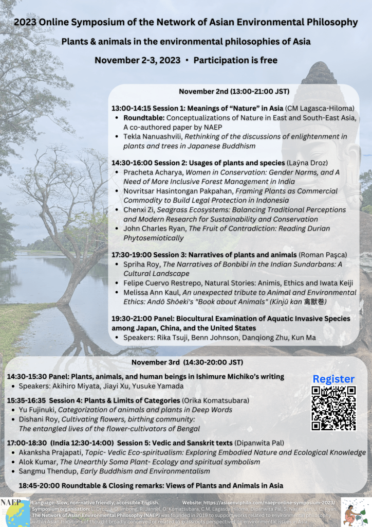 Environmental philosophy explores the ways we, humans, relate to the environment. The environment, or “Nature”, encompasses a large variety of elements, including plants and animals. In Asia, diverse worldviews, traditions, philosophies and grassroots perspectives approach plants and animals through different categories, conceptualizations and narratives. This symposium aims to support exchanges on this diversity to foster dialogue towards sustainable solutions.